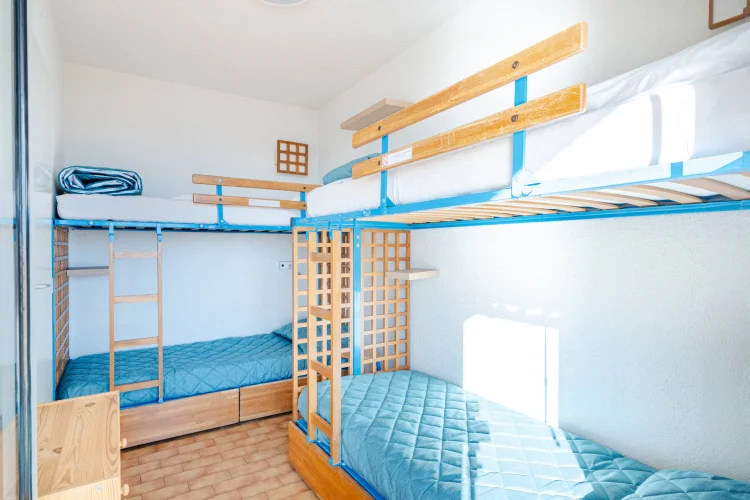 Camera con letto matrimoniale, 2 x 2 letti a castello, e soggiorno con divano letto estraibile.