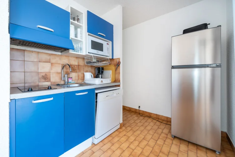 Angolo cottura completamente attrezzato: lavastoviglie, microonde, frigorifero-congelatore, tostapane, bollitore, macchina per caffè a filtro.